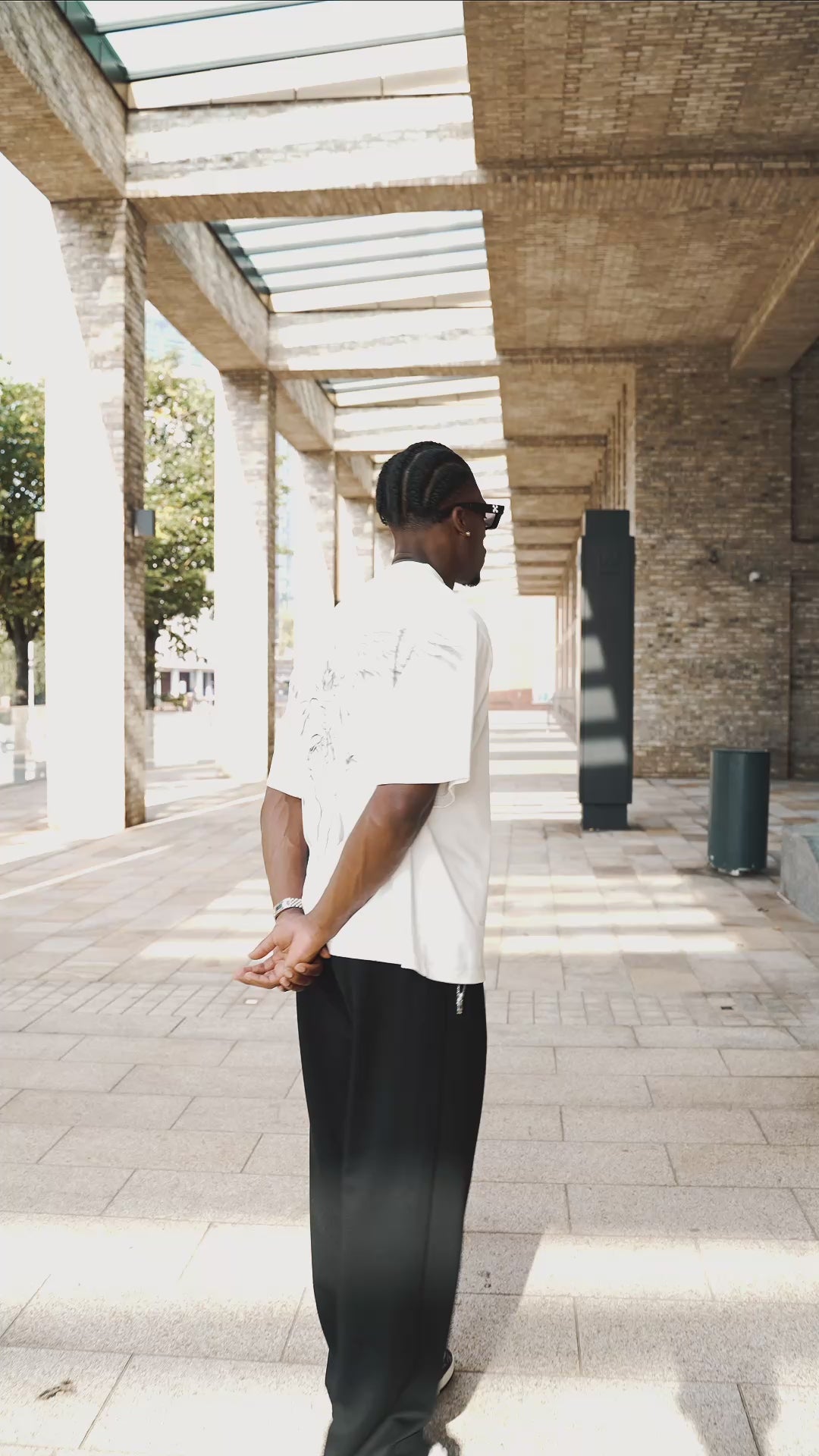 An oversized box fit, dropped shoulders, and wide sleeves create a silhouette that sits off the body with intent.